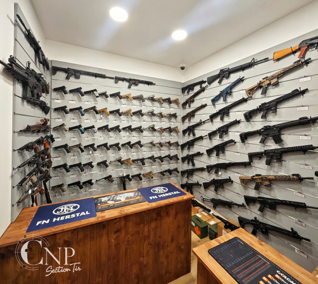 - Une chambre forte accessible proposant une centaine d’armes de catégorie B neuves ou d’occasion (sur présentation d’autorisations préfectorales)